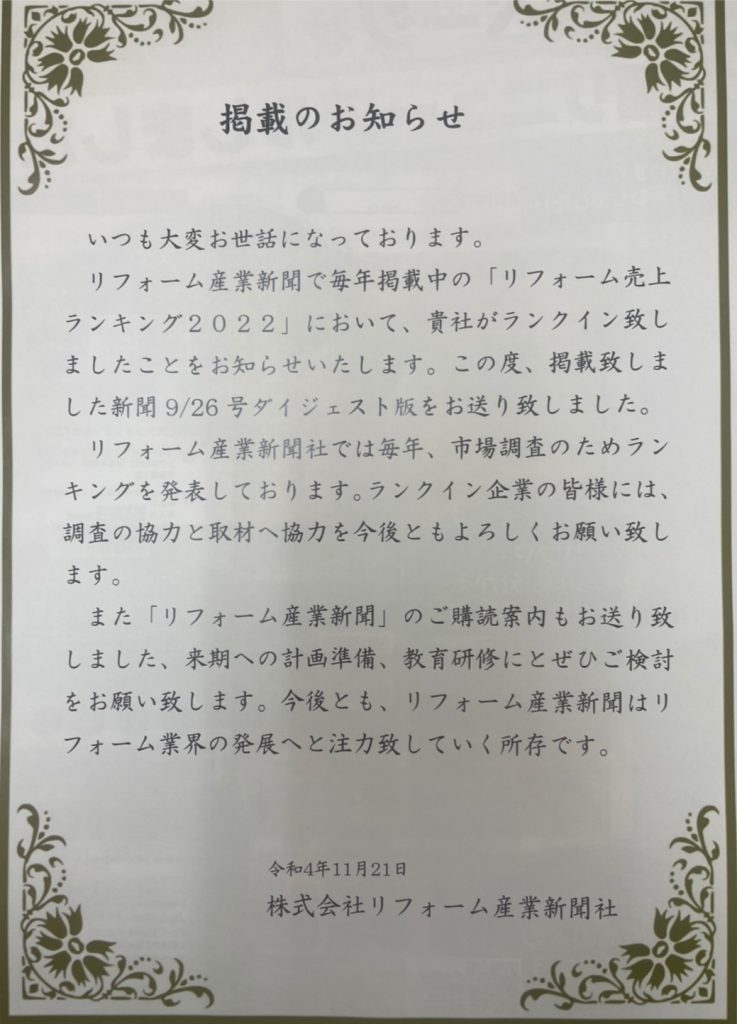 リフォーム産業新聞で売上ランキング2022年にランクインいたしました!
