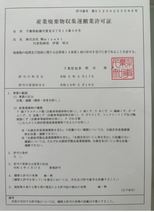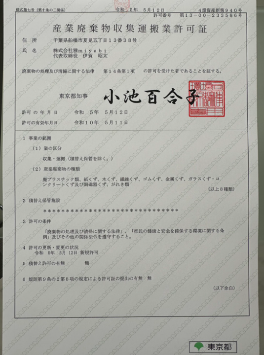 産廃収集運搬は都道府県知事の産業廃棄物収集運搬業許可を持つ業者のみが行うことができるものとなります。