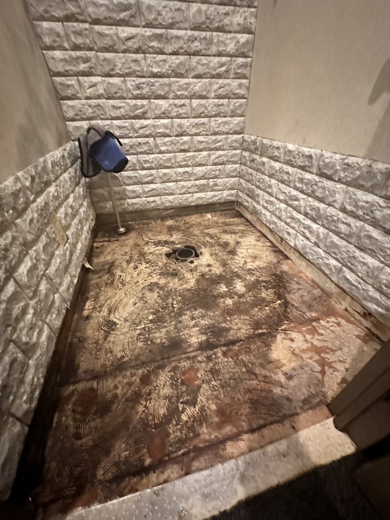 クッションフロアには全体的に黒カビが見受けられ、一部剥がれて床材が露出しています。さらに、便器も一部浮いており不安定で危険な状態でした。