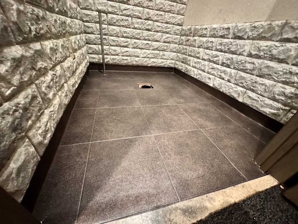 水漏れの修理を行い、床材とクッションフロアを張り替えました。黒いタイル調のものを選択することでモダンで落ち着いた印象に。便器や壁紙はそのままなのに見違えるように清潔な印象になりました。スタイリッシュでオシャレなデザインですよね!